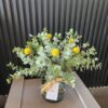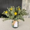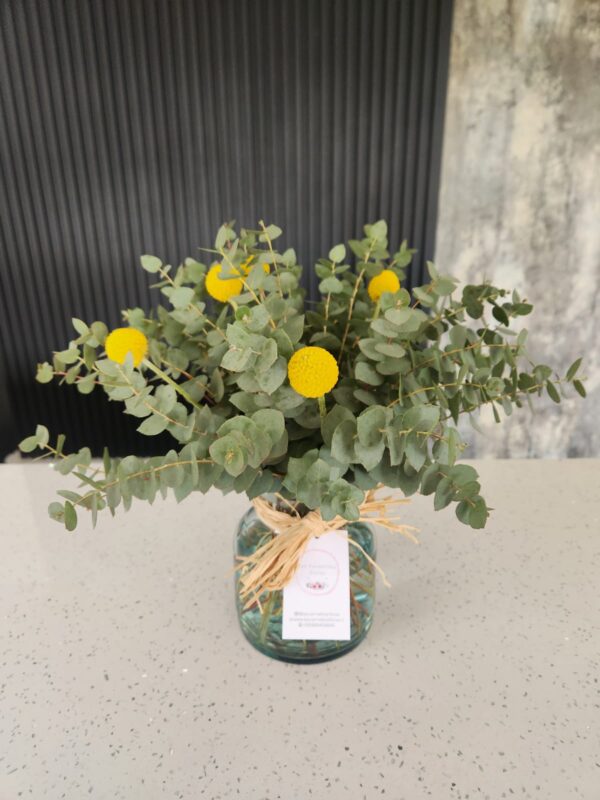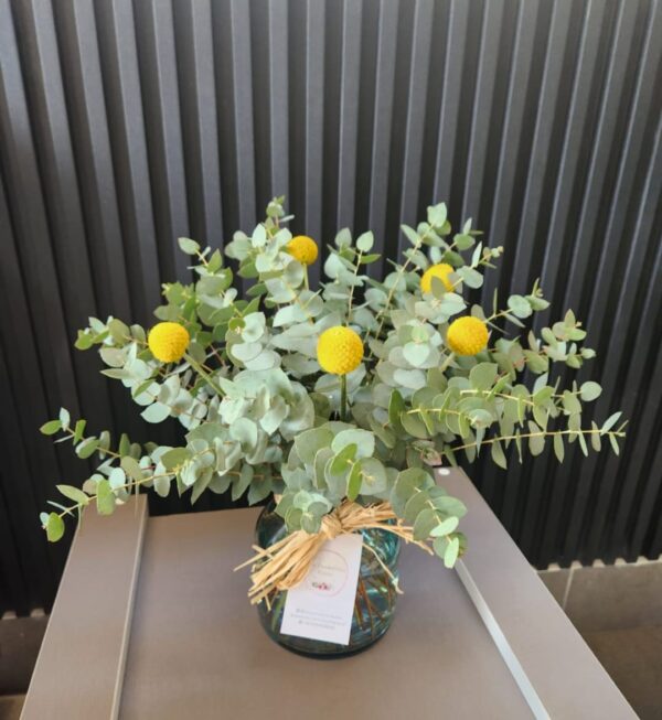 Un diseño en jarrón de vidrio de estilo greenery, minimalista y elegante. Con la frescura del eucalipto y el toque vibrante de las craspedias, este arreglo está pensado para decorar tus espacios y llenarlos de naturaleza y armonía 🌿💛.