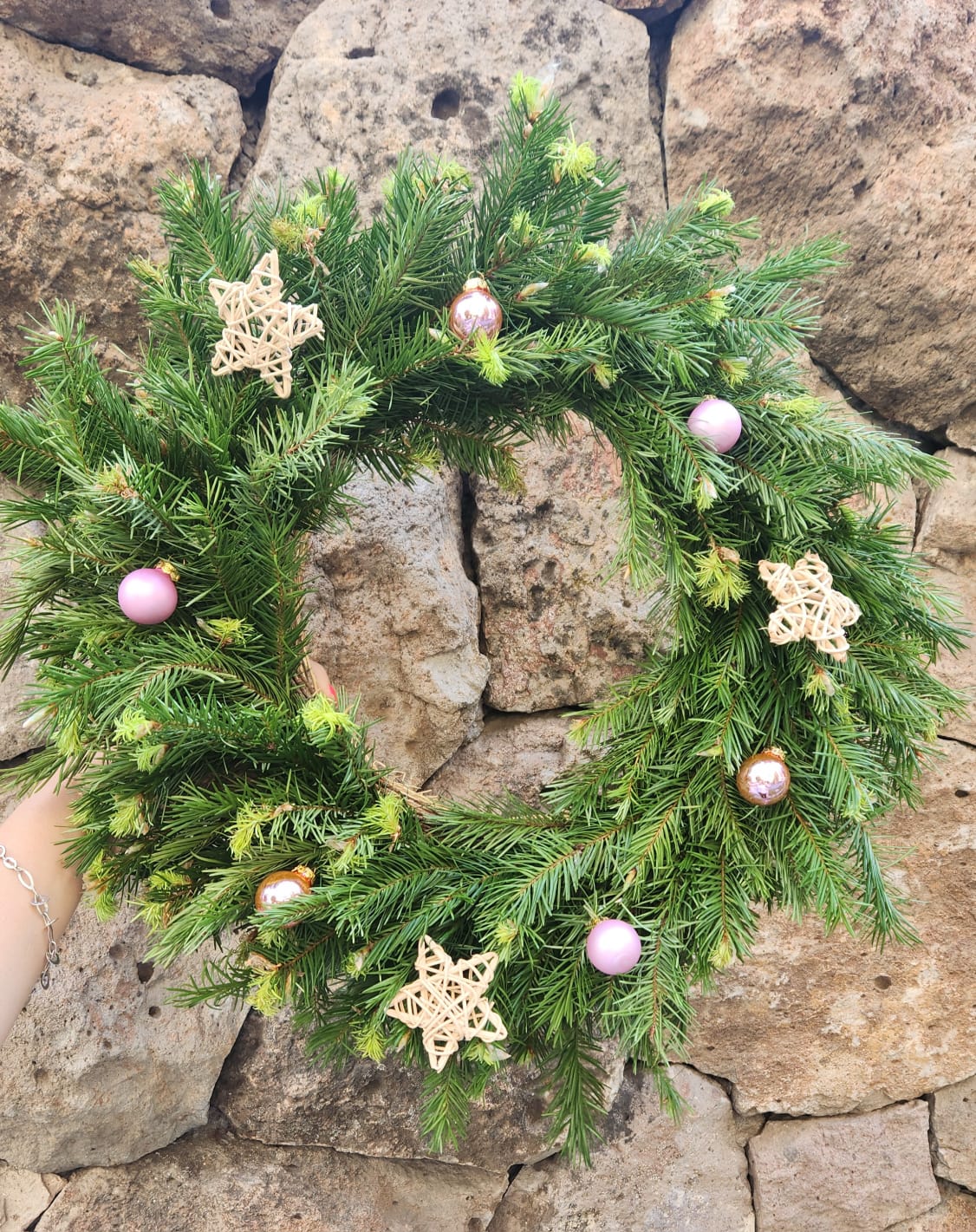 Corona de Navidad en pino, decorada con estrellas de mimbre y esferas de colores.